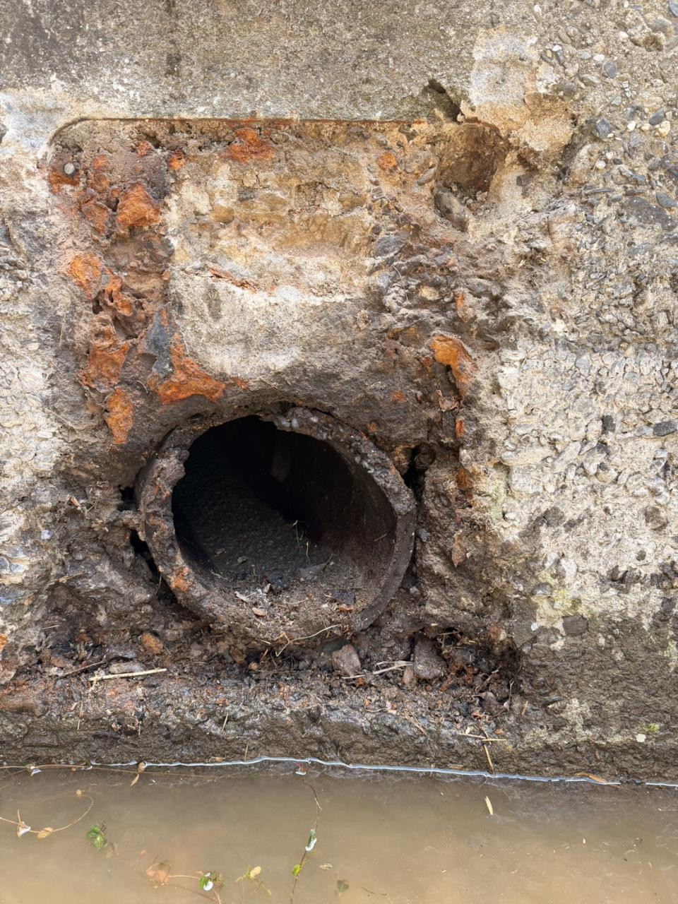取水管のまわりがかなり古くなっていて、コンクリートも崩れ、水漏れも大きい状態。